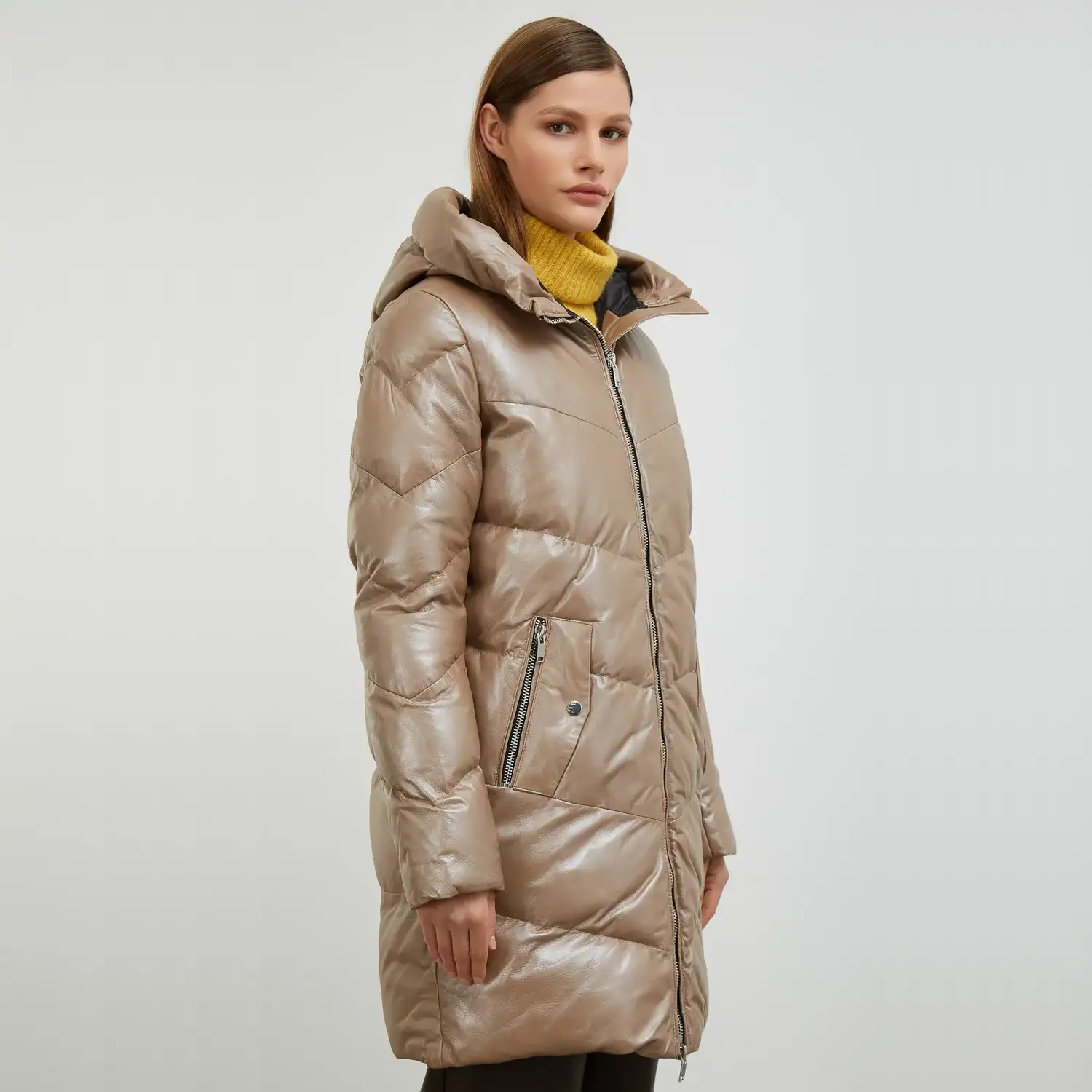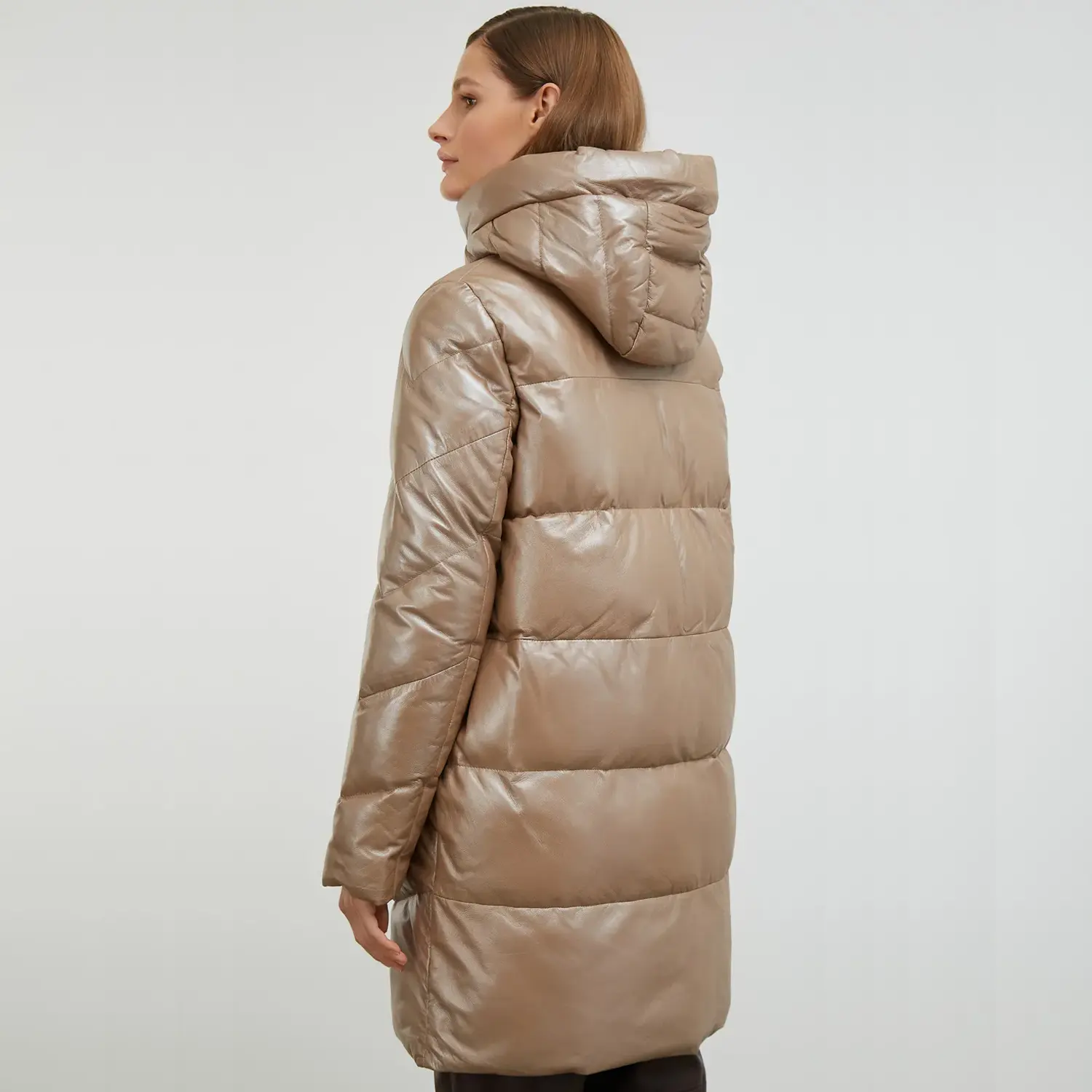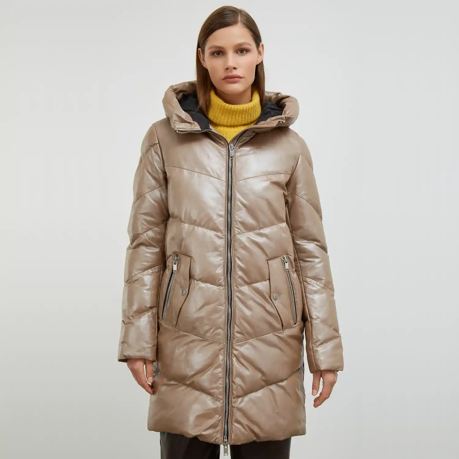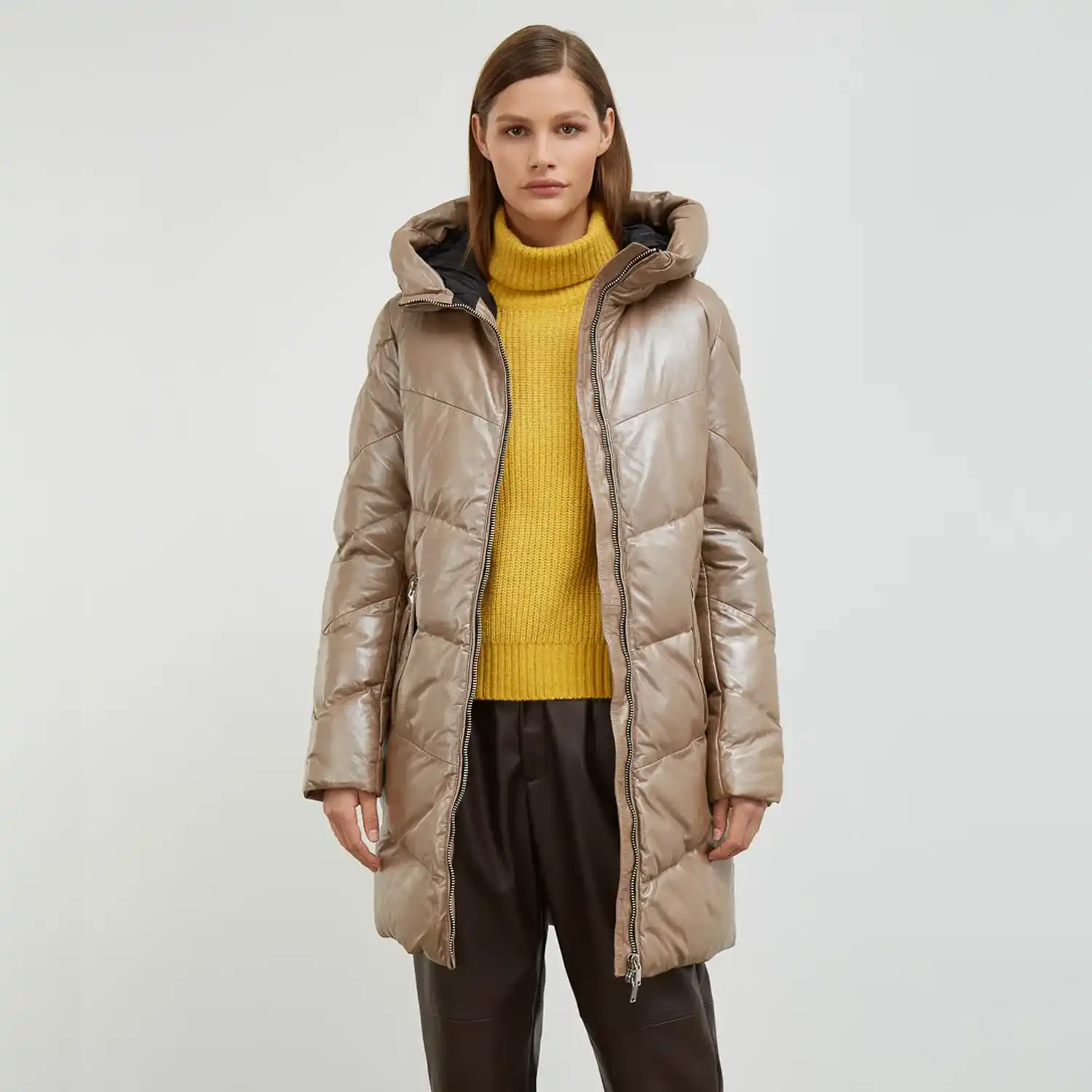 A long beige puffer coat is available in lambskin or PU leather offers both luxury and durability. The lambskin provides a soft texture and a high-end feel, while PU leather is an affordable eco-friendly alternative. Perfect for those looking to combine warmth with polished style this winter.