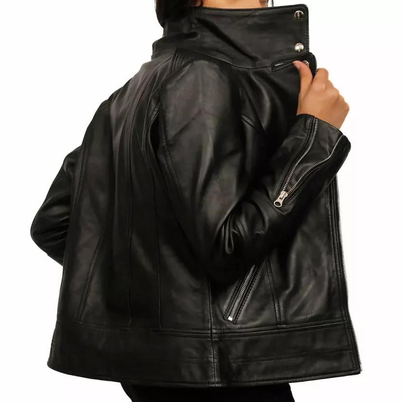 If you are fond of bike riding, you can go for our black-colored biker jacket. This womens black leather moto jacket is made from soft lambskin leather, giving it a sleek look. It features a zipper closure and a comfortable polyester lining. With two side pockets and one inside pocket, it’s practical for everyday use. The black leather jacket includes a lapel collar with snap buttons and long sleeves, making it a stylish choice for various events. Perfect for casual wear or a night out, this jacket combines quality materials with a simple yet elegant design.
