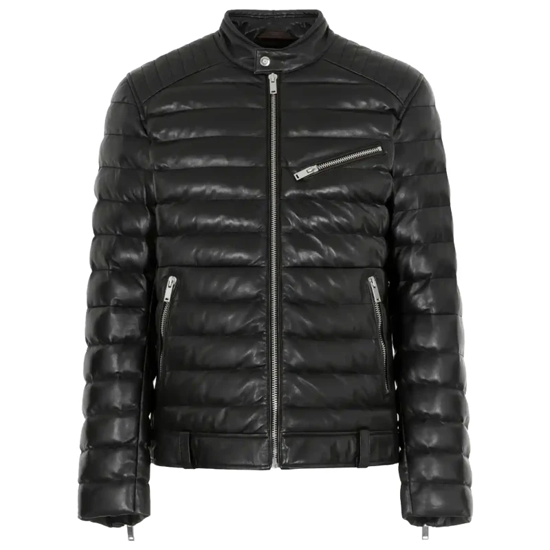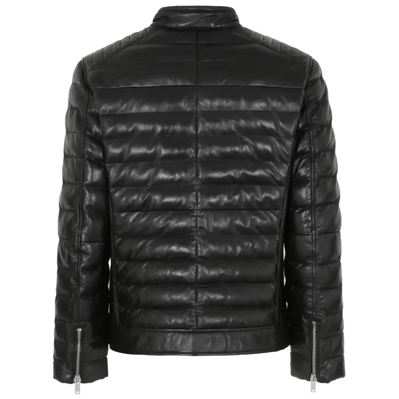From the meeting room to the lounge, our black shiny puffer jacket will never let you go out of style. It is manufactured from lambskin or PU leather, which ensures durability. The soft polyester lining protects your body in the cold weather while it keeps you breathable in summer. It has clean and horizontal lines all over the jacket to add a visual character. However, the front zipper closure adds convenience and a secure fit. The black shiny puffer jacket has a mandarin collar with a snap button that can quickly adapt to any occasion due to its minimalistic aesthetics. Its puffer style gives your body the right lift and volume, while the long sleeves keep your hands warm. This coat has three outer pockets: one chest pocket, two side pockets with zipper, and two inside pockets. Each pocket has plenty of space for your everyday stuff. Whether going out with friends or getting ready for a special night, this black shiny puffer jacket mens will make your every look glamorous with its fashionable look.Ā
