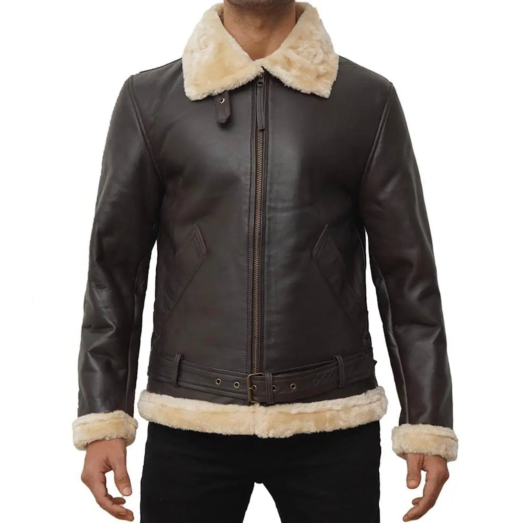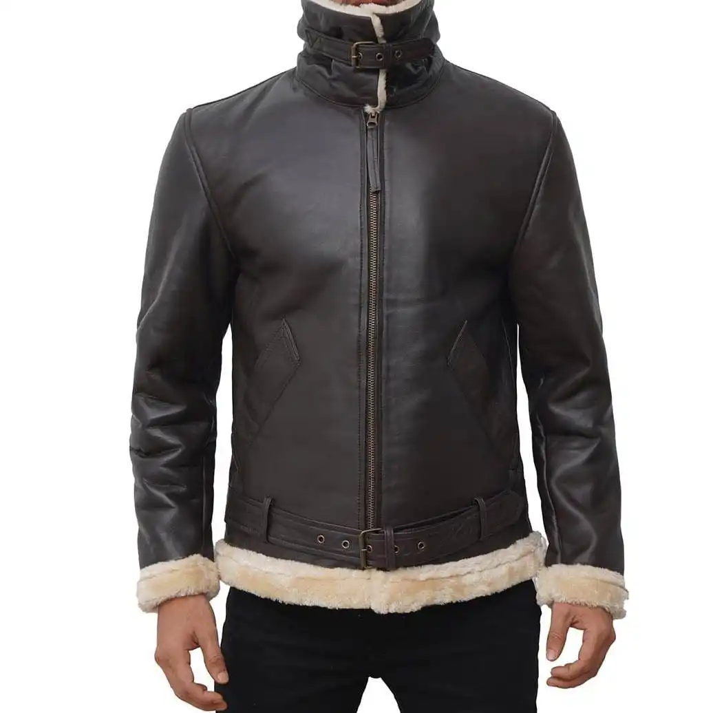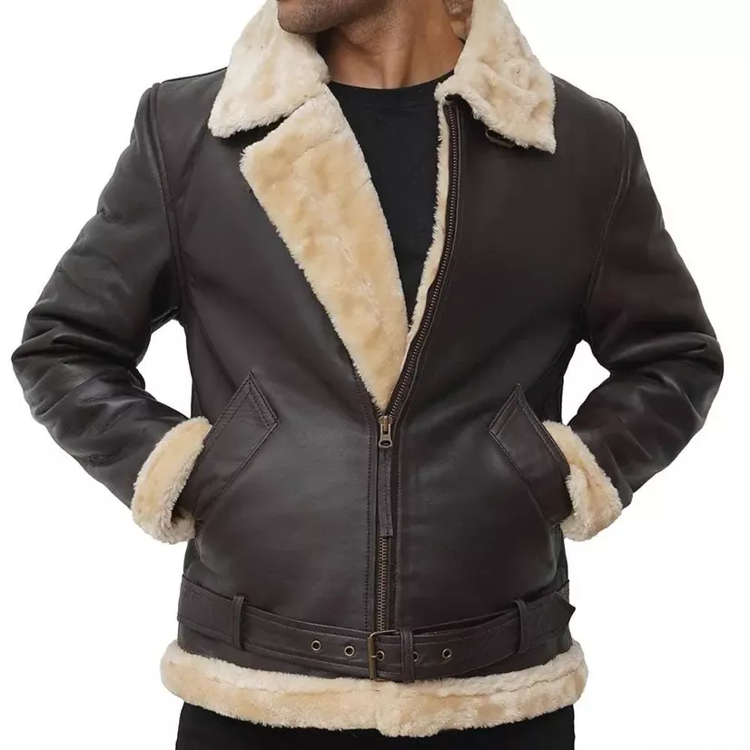 Step out confidently by owning the conventional style of a brown leather jacket with fur collar men’s. It is made from lambskin or PU leather, which makes it long-lasting to wear. Its soft polyester lining adds the right amount of comfort and warmth. This jacket has a front zipper closure that allows easy wearing, while the soft brown finish adds a polished look. The leather jacket has a stand collar with off-white furs to protect your neck on chilly nights. However, the hemline and cuffs with shearling add a fashionable touch to its powerful appearance. An extra brown belt slightly above the hemline complements its masculine structure. The mens brown leather jacket with fur collar is perfect for cherishing your bold personality without sacrificing comfort.