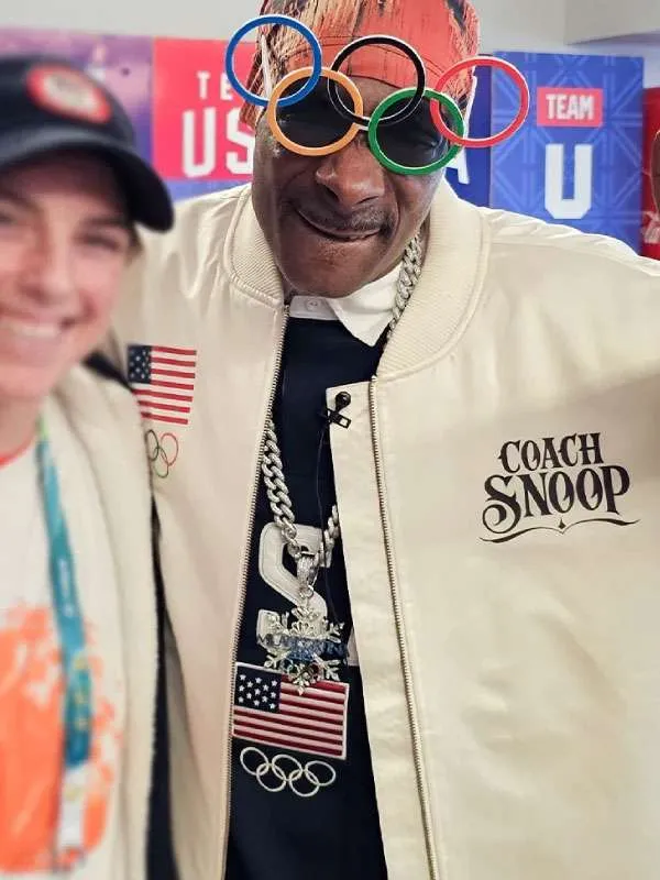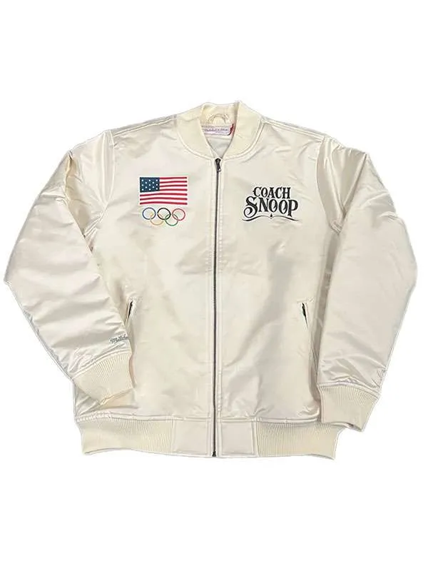 Buy Winter Olympics 2026 Team USA Coach Snoop Dogg White Satin Bomber Jacket