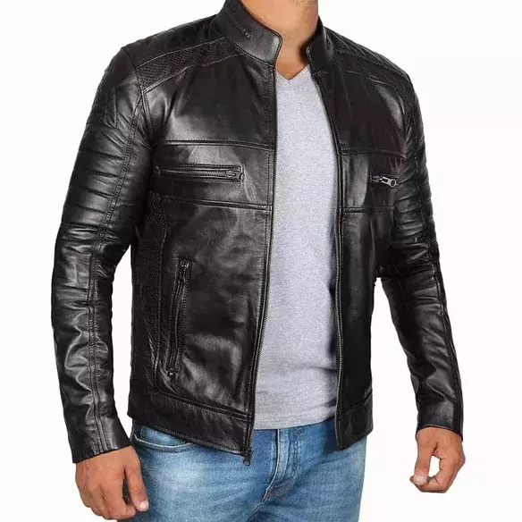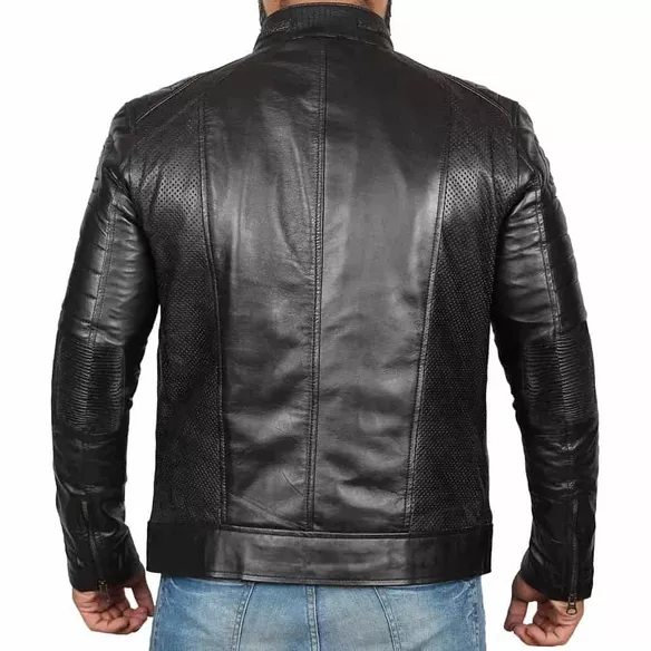 Feel like a true biker with our Men’s Black Leather Motorcycle Jacket. Made from lambskin leather, it’s strong and comfortable. The vintage style gives it a cool, antique look, and the soft lining keeps you warm. It has a front zipper and plenty of pockets for your things. The stand-up collar with a snap button and long sleeves with elbow patches gives you an elegant appearance. It is perfect for everyday wear or riding your bike and is available in different sizes to fit you just right.