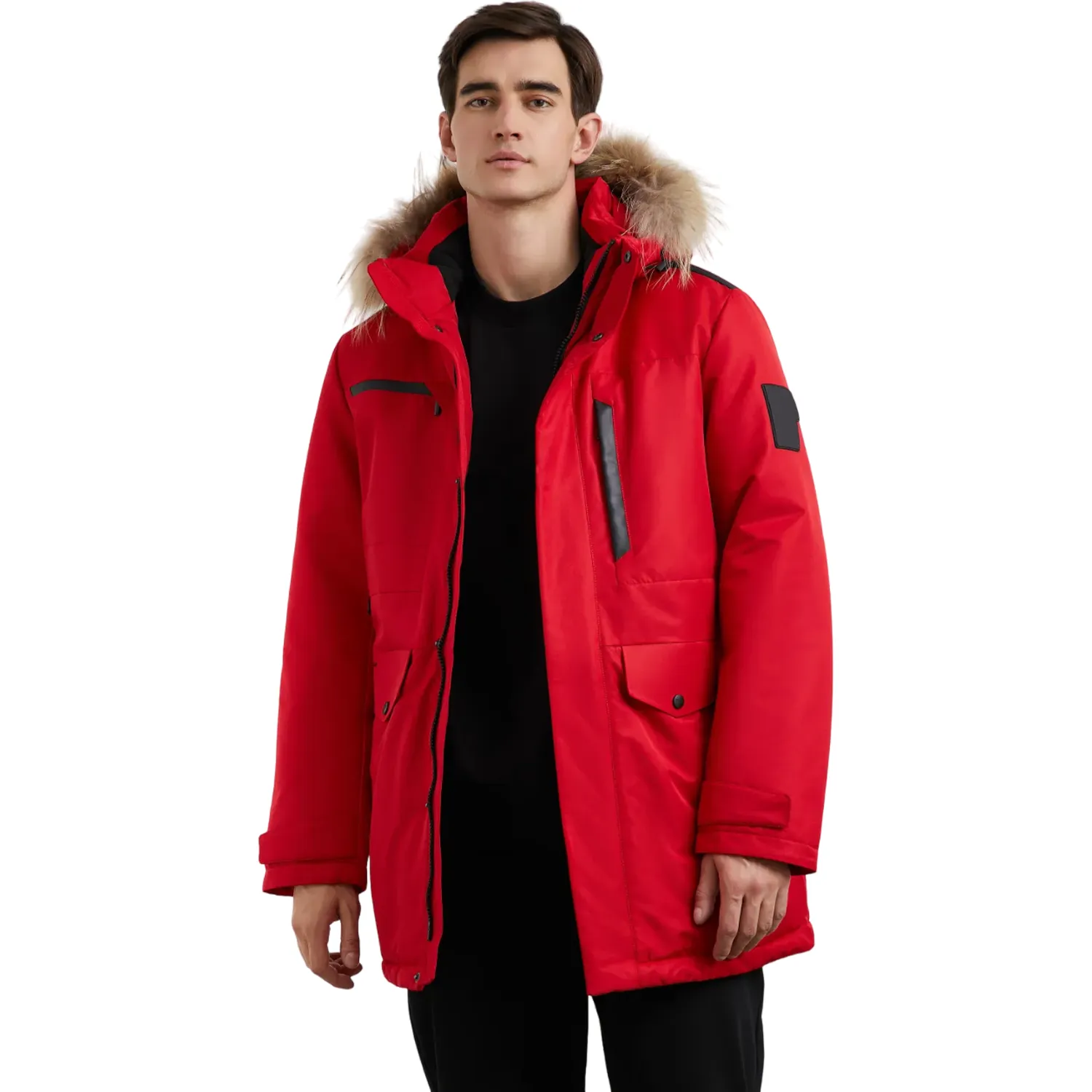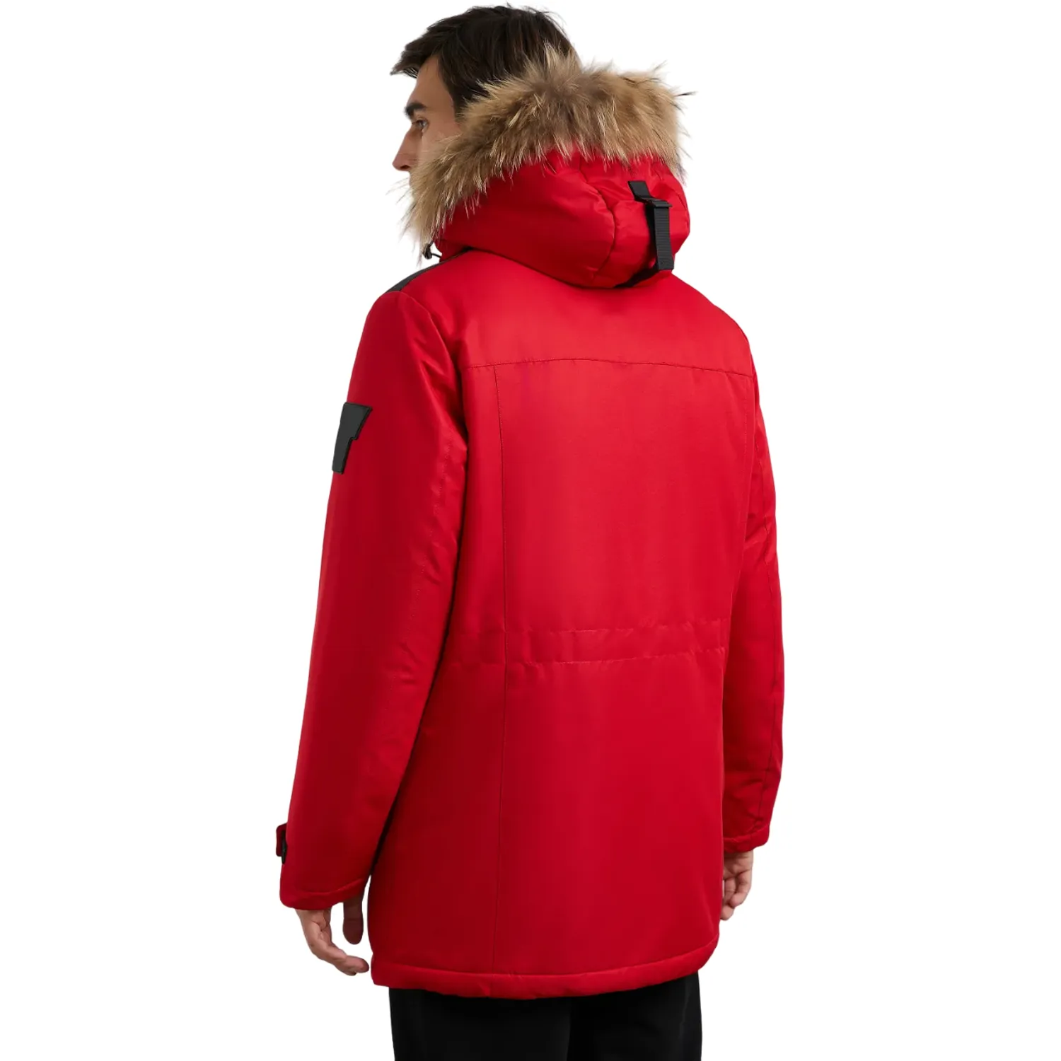 Red Winter Coat With Faux Fur Hood For Men