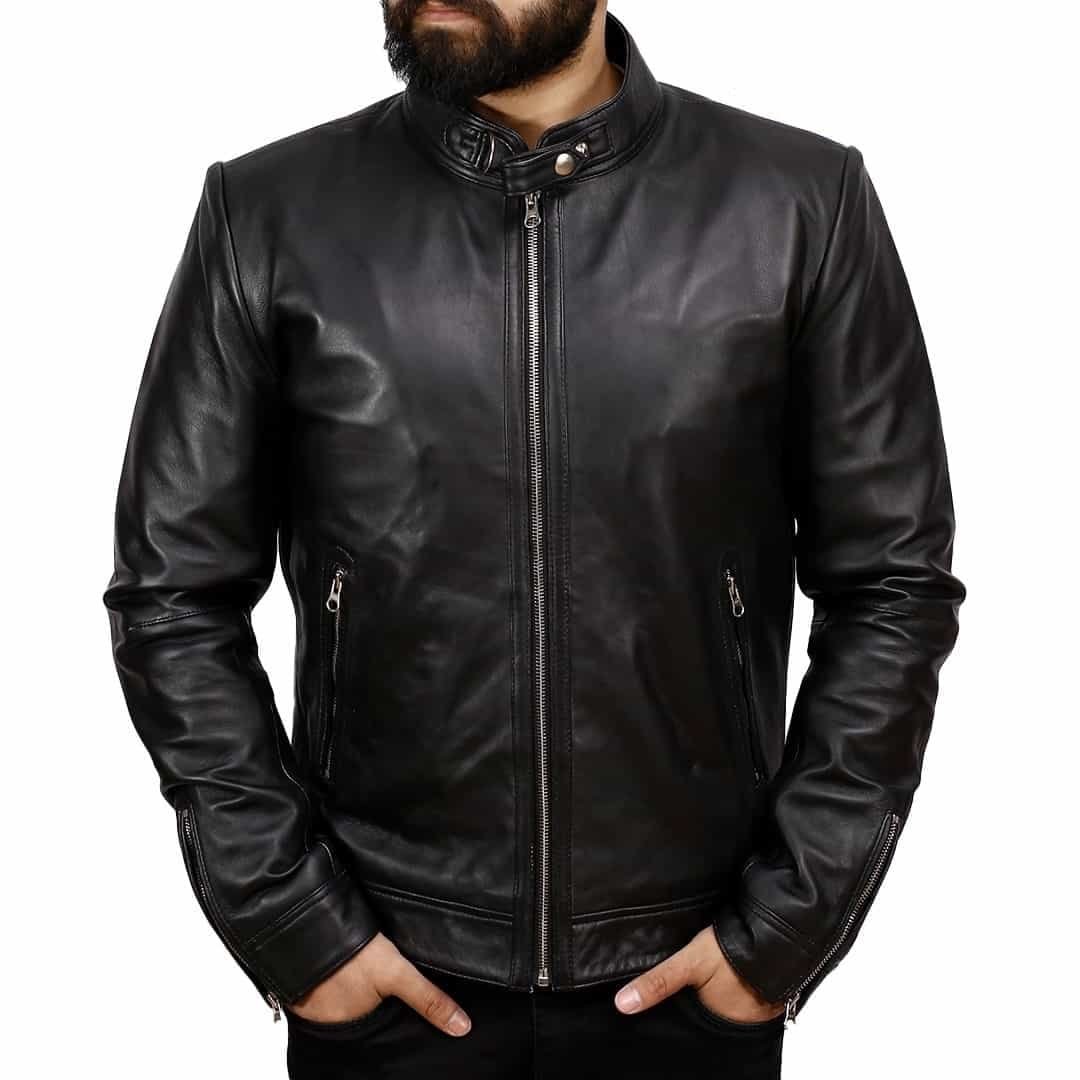 Improve your everyday style with our real leather moto jacket. This black leather jacket is constructed with lambskin or PU leather with an inner soft lining for a soft feel. It has stylish features of a stand collar with button closure and front zipper closure that add a classic touch while its two side pockets, two chest pockets, and one inner pocket provide ample storage to keep your stuff securely. Whether you are attending a business meeting, riding on a bike, or doing roadside adventure, this moto black leather jacket will always keep you classic and confident.