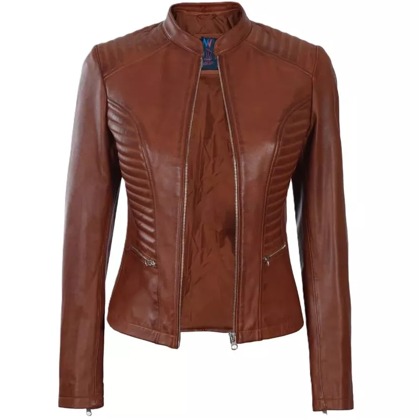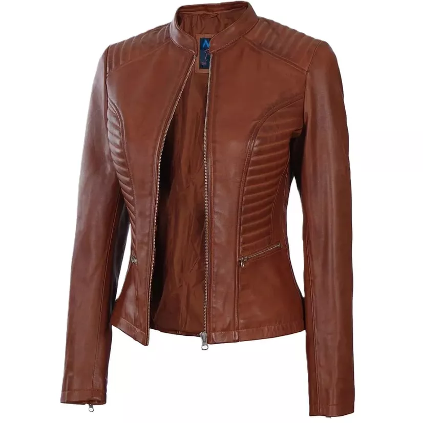 Casual Slim Fit Cafe Racer Cognac Leather Jacket Womens